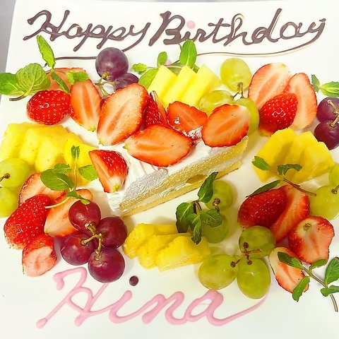 思い出に残したい大切なお祝いに、華やかなフルーツとケーキを組み合わせた一皿をご用意いたします。ご希望のお名前や文字を添えて、心に残るサプライズを演出してみてはいかがでしょうか。色とりどりの果実がテーブルを鮮やかに彩り、特別な夜をより一層盛り上げるお手伝いをいたします!誕生日などの記念日に、ぜひ当店をご利用ください♪
