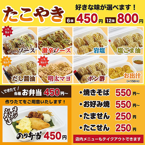 本場大阪の味をこの価格で! 6個450円から楽しめる、コスパ抜群のたこ焼きです。外はカリッと香ばしく、中は秘伝の出汁が効いたトロトロの生地が特徴。定番ソースはもちろん、だし醤油や塩など、各種トッピングで様々な味を試すのもおすすめです。お持ち帰りも大歓迎!