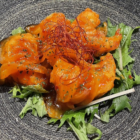 特別な環境で育て上げられた地鶏「天草大王」を味わうことが出来るのは飯塚ではここだけ!しっかりと管理されて育てられた鶏肉は柔らかく臭みもなく、肉の旨みを楽しめる極上の地鶏です★そんな天草大王を《もも肉の炭火焼風》に仕上げました♪ジューシーな鶏肉を炭火焼風に仕上げた香り高い一品です★お酒と一緒に是非◎