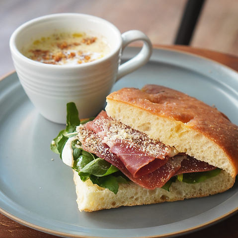 国分寺産のルッコラと生ハムロースをサンドしたこだわりのフォカッチャサンド