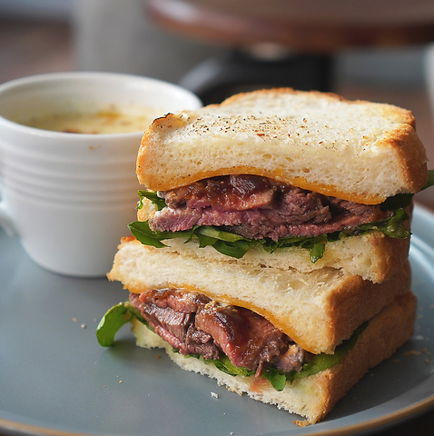 和風オニオンソースとレフォールソース食べ応えのあるローストビーフサンドウィッチ