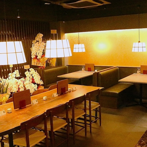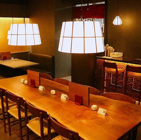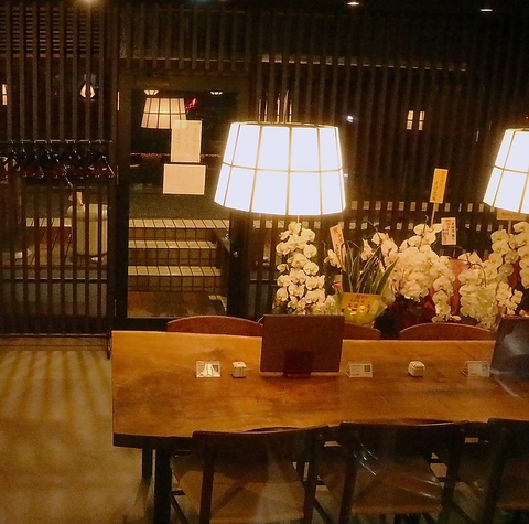 間接照明が柔らかく照らす落ち着いたボックス席で、ゆったりと食事を楽しめる和モダン空間。木の温もりを感じるインテリアと程よいプライベート感が、会食からご友人同士のお食事まで幅広く心地よい時間を演出します。