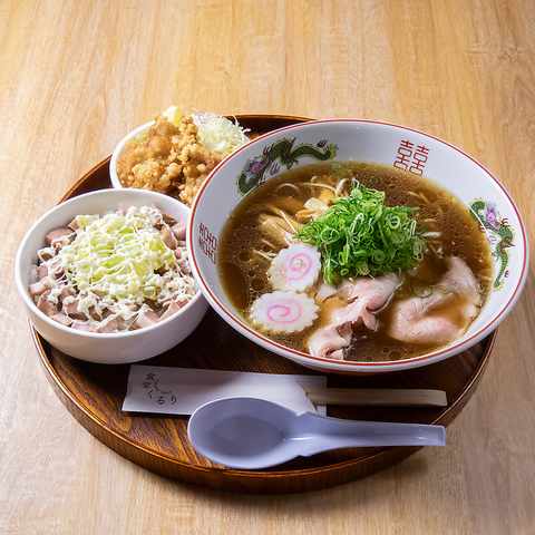 揚げ物から麺類、丼ものまで、その日の気分で選べる多彩なラインナップが魅力です!「鶏の唐揚げ定食」や、アジフライ・唐揚げ・エビフライを一度に楽しめる贅沢な「ミックスフライ定食」など、どれも食べ応え十分。また、豚骨×鶏ガラ×ねぎ油が香る「くろり中華そば定食」1,100円は、揚げ焼売やご飯も付いた大満足のセットです♪