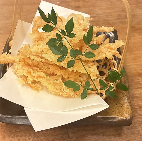 じっくり煮込んだ自慢のおでんを贅沢に天ぷらへと昇華させました。一口噛めば、サクッとした衣の中から溢れ出す熱々の出汁と素材の旨味が口いっぱいに広がります。日本酒や焼酎の香りを引き立てる逸品です。ぜひ大切な方とシェアしてお楽しみください♪
