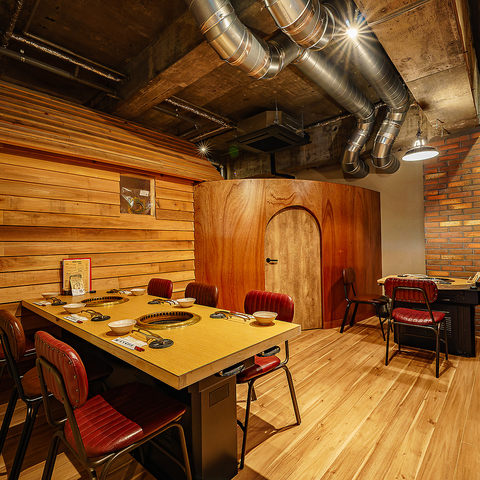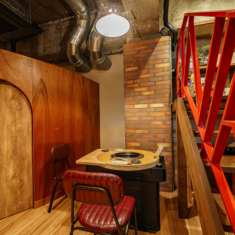 レンガ調の壁や色鮮やかな階段が目を引く、おしゃれな空間です♪各テーブルはロースター完備で、煙を気にせず快適にお食事を楽しめます◎ゆったりくつろげる個室空間は、女子会やデートにぴったり!こだわりのインテリアに囲まれながら、至福のひとときをお過ごしください。