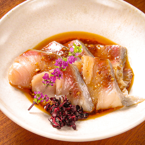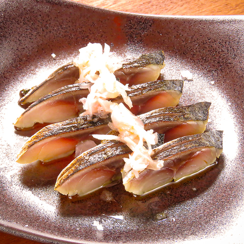 脂ののった〆鯖に、シャキッとしたガリをたっぷりのせた爽やかな一品。酢のほどよい酸味とガリの甘辛さが絶妙に重なり、後味はさっぱり。お酒との相性も良く、箸休めにもぴったりで何度でも食べたくなる味わいです。
