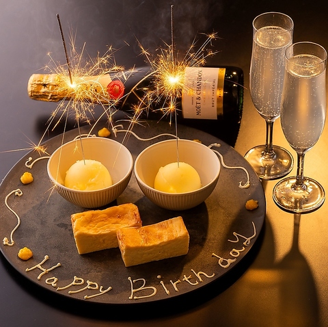 誕生日や記念日などの特別な日にぴったりのサプライズプレートもご用意可能。メッセージ付きのデザートプレートに花火を添えて、大切な方へのお祝いを華やかに演出します。スタッフもサプライズをお手伝いするので、思い出に残るひとときをお過ごしいただけます。事前のご相談で内容のご希望も対応可能です。