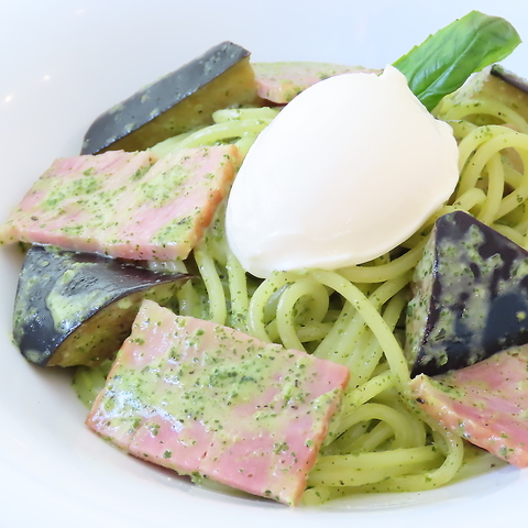 香ばしく揚げたジューシーな茄子と、旨みたっぷりのベーコンを合わせたジェノベーゼパスタ。バジルの爽やかな香りとコク深いソースが具材によく絡み、仕上げにとろーり溶けたチーズを贅沢にトッピングしました。