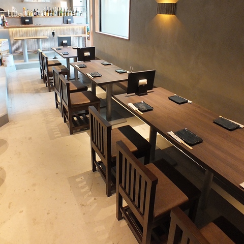 和を基調とした、落ち着く雰囲気の店内。ライブ感満載のカウンター席や、様々なシーンでご利用可能なベンチシートのテーブル席、開放的なテラス席など、、、多様なシーンで大活躍間違いなし♪