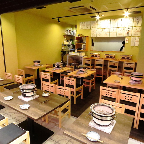 開店前のしんとした店内。各テーブルに整然と並ぶ七輪が、今夜の飲み会を静かに待ち構える。