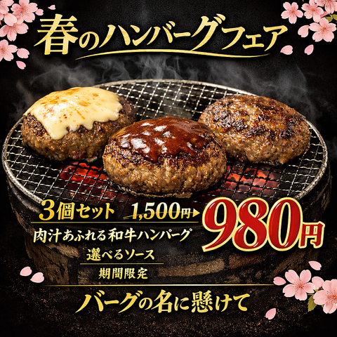 今だけの春のキャンペーン開催中♪バーグ3つセットが1,500円→980円!