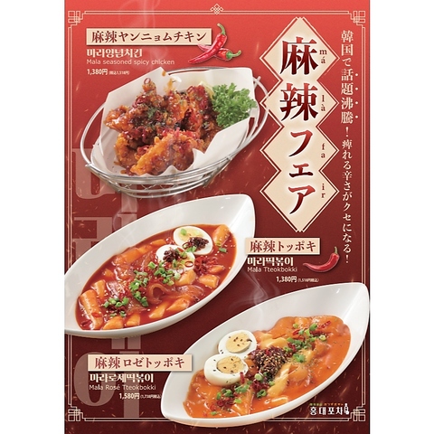 【期間限定】ホンデポチャで話題沸騰中の「麻辣フェア」が開催中!韓国で大流行しているシビれる辛さがクセになるメニューが勢揃いです♪刺激的な「麻辣ヤンニョムチキン」や、マイルドな「麻辣ロゼトッポキ」など、お酒も進む中毒性抜群のラインナップ☆ぜひこのお試しください!