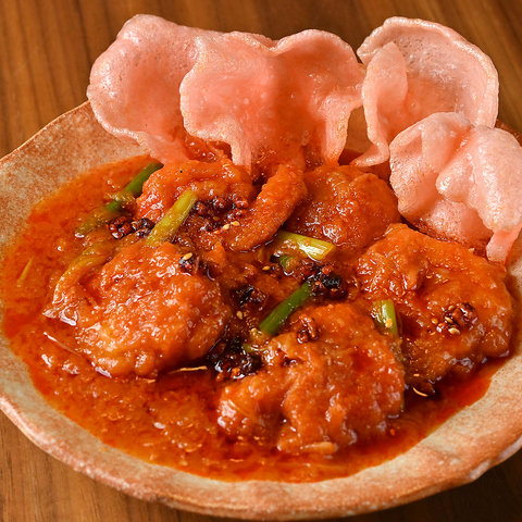 プリプリの海老を使用した人気の海老チリ。旨味たっぷりの特製ソースが絡み、少し辛めに仕上げているので、お酒にもよく合う一品です心も身体も温まりますよ。