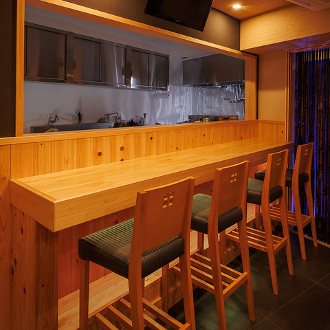 店主との距離が近いカウンター席は、お一人様や少人数でのご利用に最適。落ち着いた灯りに包まれた和モダンな空間で、料理が仕上がる様子を楽しみながらゆったりとお過ごしいただけます。仕事帰りの一杯や大切な方との語らいにもぴったりの特等席です。