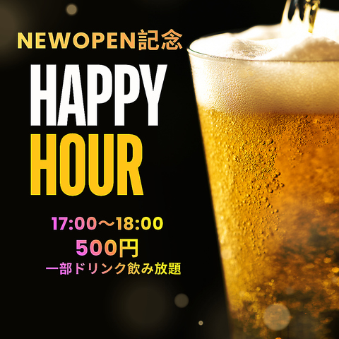 今だけ限定のNewOPEN記念ハッピーアワー開催中!!17:00~18:00までの間500円で瓶ビール、角ハイ、レモンサワー、黒霧島、赤兎馬が飲み放題!!3月いっぱいで終了のためこの機会にぜひ足をお運びください!