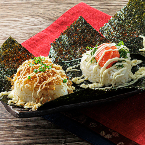 小さなおにぎりにとり鉄特製タレをたっぷりつけた唐揚げをのせたとり鉄特製の天むすです。