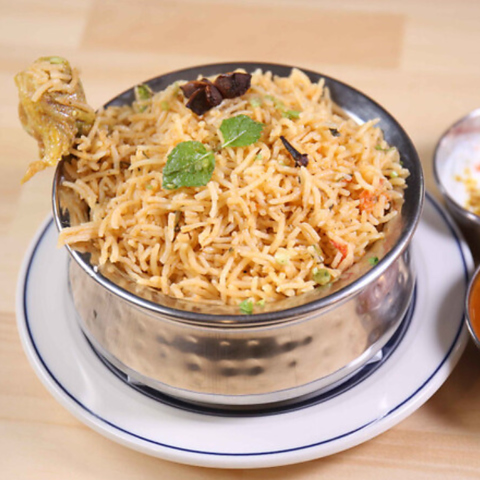 熟練のインド人シェフが作る、本物志向の南インド料理店。看板メニューの「ビリヤニ」は、最高級のバスマティライスと秘伝のスパイスを使い、チキンやマトンがゴロゴロ入った満足度抜群の一皿です。ライタ(ヨーグルトソース)で味変を楽しみながら、現地さながらの力強い味わいをぜひご堪能ください。