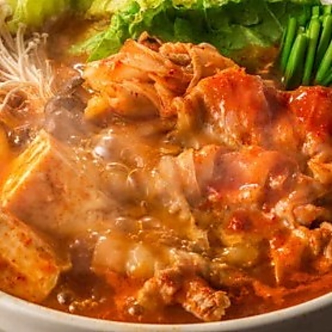 グツグツと煮え立つ真っ赤なスープから、熟成キムチの酸味とニンニクの香りが立ち上り、一気に食欲を刺激します。豚肉の甘い脂と魚介の旨味が溶け込んだピリ辛スープは、体の芯から温まる深いコクが自慢。最後の一滴まで旨味を余すことなく堪能できちゃいます!