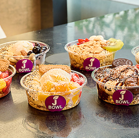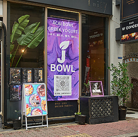 紫と金を基調にしたJ BOWLの大型看板が目印。ガラス張りの明るい外観で、路面店のため入りやすい雰囲気です。店頭にはメニューのスタンド看板も設置しており、初めての方でも安心。心斎橋の路地に佇む、スタイリッシュで目を引く外観です。