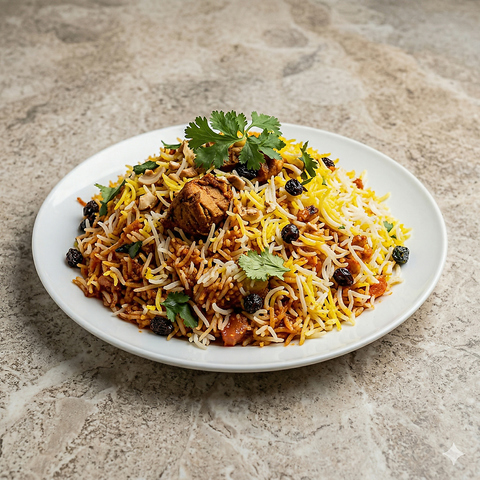 芳醇なスパイスの香りが広がる、究極のチキンビリヤニ。パラパラとしたバスマティライスの白、黄、オレンジのコントラストが美しい。中心に隠れた大ぶりのチキンは、噛むほどに旨味が溢れます。カシューナッツのカリッとした食感とレーズンの上品な甘みが絡み合い、パクチーが爽やかに締めくくる。一度食べれば虜になる、伝統の深い味わいをご堪能ください。