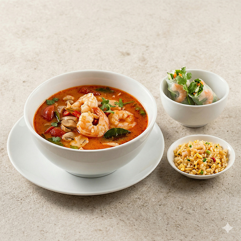 トムヤムクンの濃厚でスパイシーなスープに、モチモチ麺が絡む至高の一杯。ぷりぷりのエビと魚介の旨味が溢れ、食欲を刺激します。さらに、シャキシャキ野菜を包んだ「生春巻き」2本と、香ばしい「チャーハン」がセットに!タイの味を一気に満喫できる、お得な大満足メニューです。この充実のセットで、お腹も心も満たされること間違いなし!