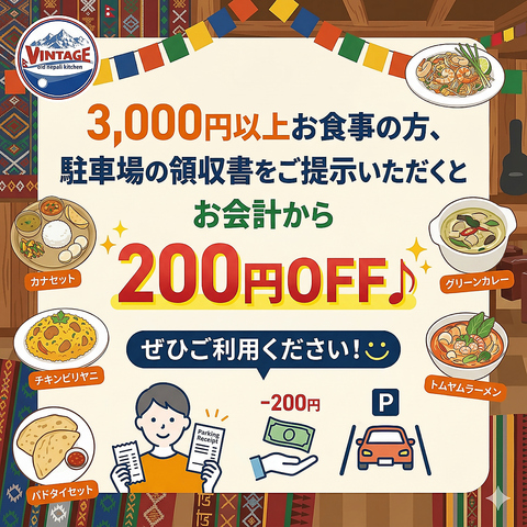 3,000円以上お食事の方、駐車場の領収書を見せていただくとお会計から200円OFF♪ぜひご利用ください!