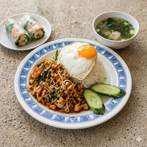 芳醇なバジルの香りとスパイスの刺激がたまらない「ガパオライスセット」。旨味溢れるひき肉に、とろ~り半熟卵を絡める瞬間はまさに至福!さらに、ぷりぷりの生春巻き2個と特製スープも付いて、お腹も心も満たされる大満足のボリュームです。本場の味を詰め込んだ贅沢な一皿を、ぜひ心ゆくまでお楽しみください。