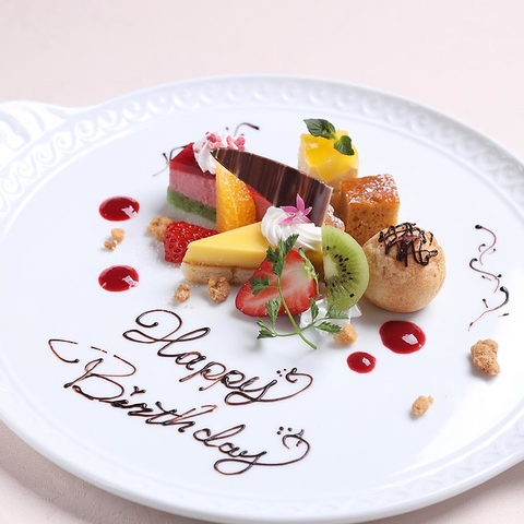 お誕生日や結婚記念日など、大切な方のお祝い事には特製のバースデープレートをご用意することが可能です。お客様の大切な一日がより思い出深いものとなるよう、スタッフ一同心を込めておもてなしいたします。ご希望のメッセージ等も承りますので、ご予約時にお気軽にご相談ください。
