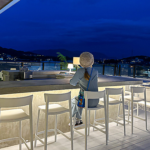 開放感あふれる外カウンターは、一人でも気軽に過ごせるゆったりとしたつくり。静かな空と街並みを眺めながら、自分だけの時間を楽しめます。白を基調とした洗練空間と控えめな灯りが心地よく、雰囲気を大切にしたい方にぴったりの特別なルーフトップです。