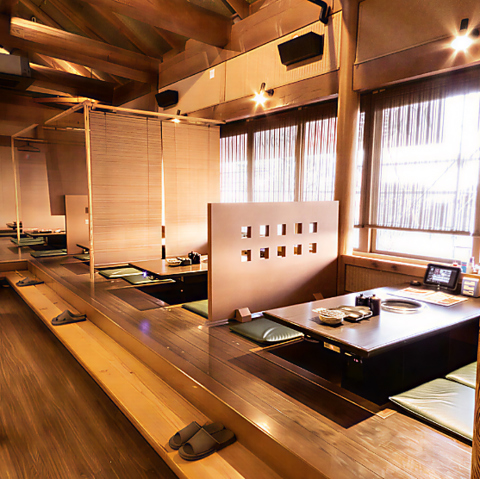 掘りごたつ個室やテーブル席など多数完備し、少人数~大人数にもぴったりな空間を提供します◎静かで落ち着いた雰囲気が魅力で、仕事帰りやデートにもふさわしいロケーション★目の前で焼き上げる香りを感じながら、気軽に会話が弾むリラックスしたひとときをお過ごしください♪