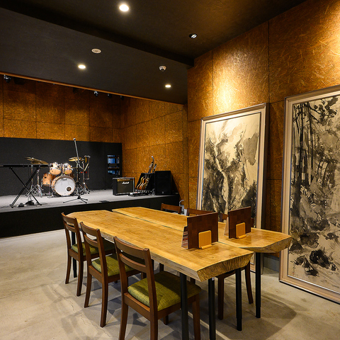 店内中央に配置された一枚板風の大きな木製長テーブルが目を惹くお洒落な空間です♪壁にはダイナミックな墨絵のようなアートが飾られており、洗練された和モダンの雰囲気を演出しています◎大人数でのグループ利用や気の置けないご友人との飲み会など、ワイワイとテーブルを囲んで楽しいひとときをお過ごしいただけます!
