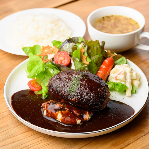 溢れる肉汁を閉じ込めた自慢のハンバーグに、じっくりと時間をかけて煮込んだ濃厚なデミグラスソースをたっぷりとかけ、肉の旨みとソースのコクを絶妙にブレンド。彩り豊かな野菜をふんだんに加えたサラダは、季節ごとの新鮮な野菜のシャキッとした食感と、軽やかなドレッシングがアクセントになっており、何気ない日常を贅沢ランチが彩ります。