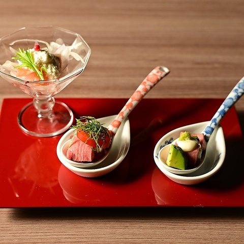 至福のお肉三昧と海の幸のハーモニーを存分に楽しむコースをご用意。日本料理の伝統を受け継ぎつつ、新たなエッセンスを加え、色とりどりに仕上げた逸品の数々をご堪能ください。