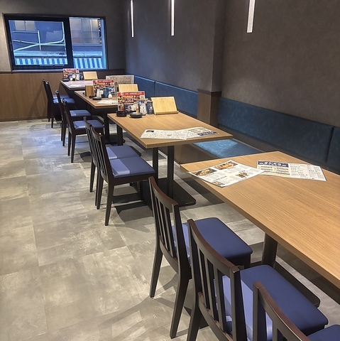 窓側に面した明るいテーブル席は、開放的な気分でお食事を楽しみたい時に最適です。片側がソファー席となっており、長時間の滞在でも疲れることなくお過ごしいただけます。お席の青がアクセントとなり、清潔感溢れる空間でお客様をお迎えします。同僚との仕事帰りの一杯にいかがですか?