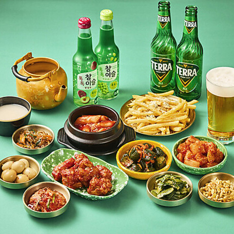種類豊富な韓国総菜の「パンチャン」やキムチバー、チャプチェやトッポギ、ヤンニョムチキンにプルコギキンパまで全10種が食べ放題のお得なコースです!飲み放題には生ビールやハイボール、マッコリも含まれており、大満足なのに気軽に楽しめるコースです♪