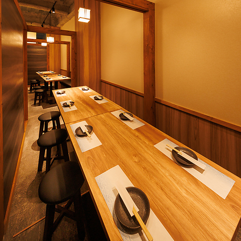 木の風合いを生かしたデザインと、照明がつくる穏やかな空気感!周囲を気にせず楽しめるプライベート空間は、接待やデートにもピッタリです!肩肘張らず過ごせる居心地の良さを大切にしています!