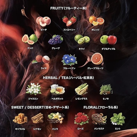フルーティー系やハーバル・紅茶系、甘めのデザート系、フローラル系など、豊富なフレーバーを厳選してご用意。知識豊富なスタッフがお客様のその日の気分に応じてセレクト!デートやお仲間でお二人さまで愉しめる「シェアチャージ」やひんやり冷たさ感じる「アイスホース」をご用意。