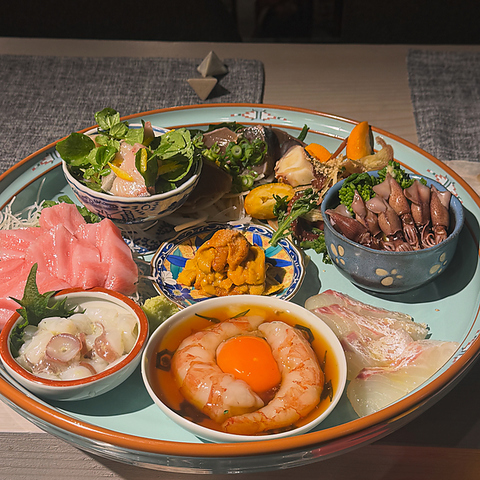 お造り9種盛りはその時期の旬の鮮魚を使用。季節や日によって内容が変わり2回目以降の来店でも新しい味に出会えます♪食べ方も醤油を使わず、トリュフオイルやポン酢などを使用し他では味わえない贅沢な一皿に仕上げました。女子会や大人数のグループでお楽しみください【(日・祝除き)2日前までの完全御予約制です】