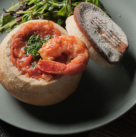 海老とホタテでしっかりと出汁をとりトマトクリームに♪味わい深いトマトクリームを贅沢に使った一品です。中をくりぬいたパンの器でたっぷりお召し上がりください♪