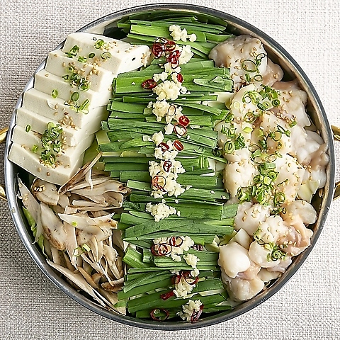 当店自慢の「黒毛和牛もつ鍋」は、鮮度と品質にこだわり抜いた黒毛和牛の小腸のみを贅沢に使用。プリップリの食感と、噛むほどに溢れ出す上質な脂の旨味が食欲をそそります。野菜の甘みが溶け出した特製スープとの相性も抜群で、最後の一滴までお楽しみいただけます。本場九州の味を、落ち着いた空間で心ゆくまでどうぞ。