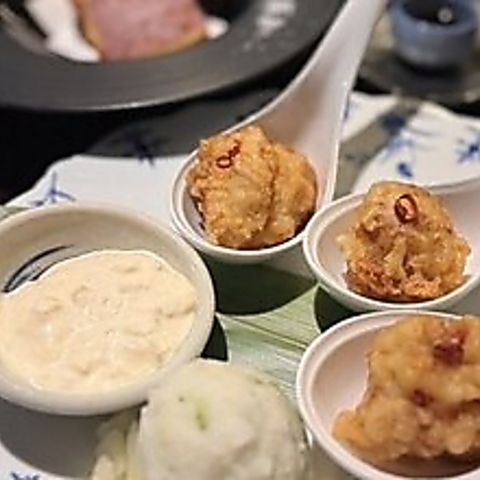 【宮崎の味を一口で!】鮮度抜群の純然鶏を使用した、揚げたて熱々のチキン南蛮です。最大の特徴は、一口でパクっと食べられる「1スプーン盛り」。手が汚れず食べやすいので、お集まりの席でも大好評です。具だくさんの自家製タルタルソースが鶏肉の味を引き立てます。あと一品、という時にもぜひご注文ください!