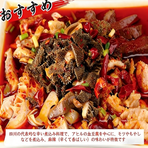 四川の代表的な辛い煮込み料理で、アヒルの血豆腐を中心に、モツやもやしなどを煮込み、麻辣(辛くて香ばしい)の味わいが特徴です。