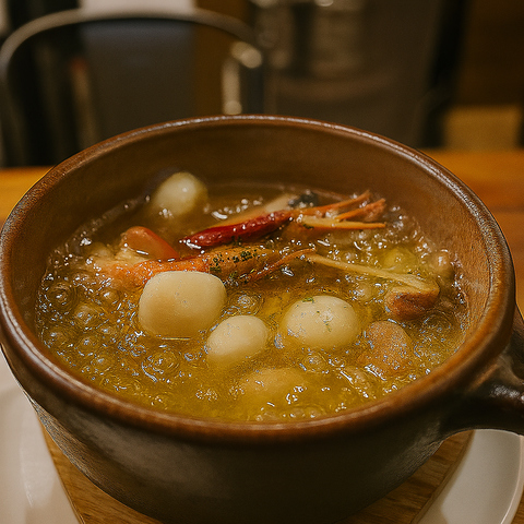 最高級のイベリコ豚を、食欲をそそるペペロンチーノ風の出汁でいただく逸品です♪脂身の甘さと肉本来の旨味をしっかり閉じ込め、しっとり柔らかな食感に仕上げました。香ばしいニンニクと鷹の爪の刺激がアクセントになり、最後の一口までお箸が止まりません。大切な方とシェアして、至福の味わいをご堪能ください。