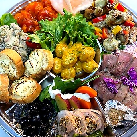 当店の味を気軽にご自宅で楽しめるテイクアウトサービスを実施中♪人気の単品メニューはもちろん、パーティーに最適なオードブルも5500円(税込)からご用意しております。オードブルは内容やボリュームなど、お客様のご予算やシーンに応じて丁寧にお作りいたします。特別な日の食卓を彩る華やかなお料理を、ぜひテイクアウトでご堪能ください。