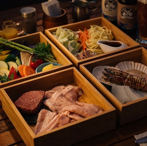 ハンバーグ、ソーセージ、海老、焼きおにぎりなど人気メニューを詰め込んだ追加サイド重。大人のBBQにもう一品足したい時はもちろん、お子様にも喜ばれる内容で家族利用にもぴったりです。みんなでシェアしながら楽しめる、満足感たっぷりの一品です。