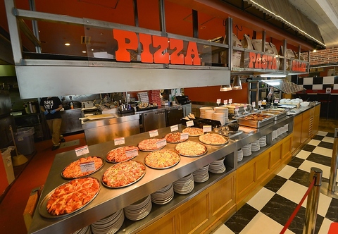 店内にはシェーキーズ自慢のメニューがずらり♪こだわりの素材で丁寧に焼き上げたアツアツの本格ピザが次々と台の上に並びます◎ピザだけでなく、パスタやフライドポテト、カレー、新鮮野菜のサラダバーまで充実の品揃え!美味しい匂いに包まれながら、お好きなメニューを心ゆくまでたっぷりとご堪能いただけます♪