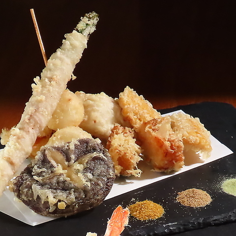 《HAREUO厳選の天婦羅盛り合わせ》は、サクッと軽い衣に包まれた海鮮・野菜・名物素材を贅沢に盛り込んだ一品。素材本来の旨みを引き立てる四種のお塩と共に味わえます。スペシャル、海鮮、野菜の盛り合わせを1,628円~ご用意。宴会を華やかに彩る至福の天ぷらです。