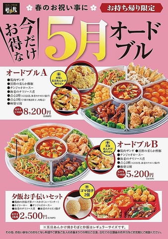 日頃お忙しい奥様必見のセットです!めやす2名様です。ユーリンチー/ホイコーロー/チンジャオロースー/海老のチリソース煮/海老のクルトン揚げ※4/29~5/31の期間は+でゴマ団子(2個入り)をプレゼント★