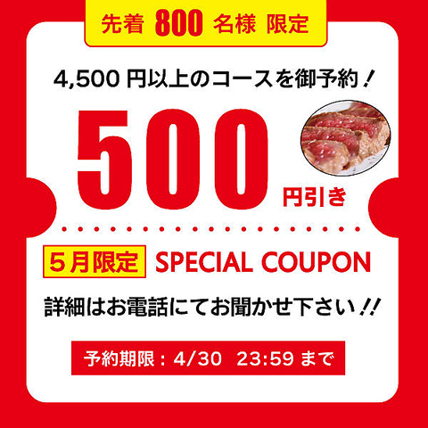 ・和牛コース 5,000円→4,500円・鮮魚のお造りコース 5,500円→5,000円 ・水炊きコース 6,000円→5,500円