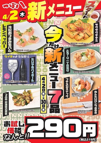 4/2(木)~30日(木)の期間、お試し価格で新メニュー7品をご注文いただけます!お気軽にご利用ください♪